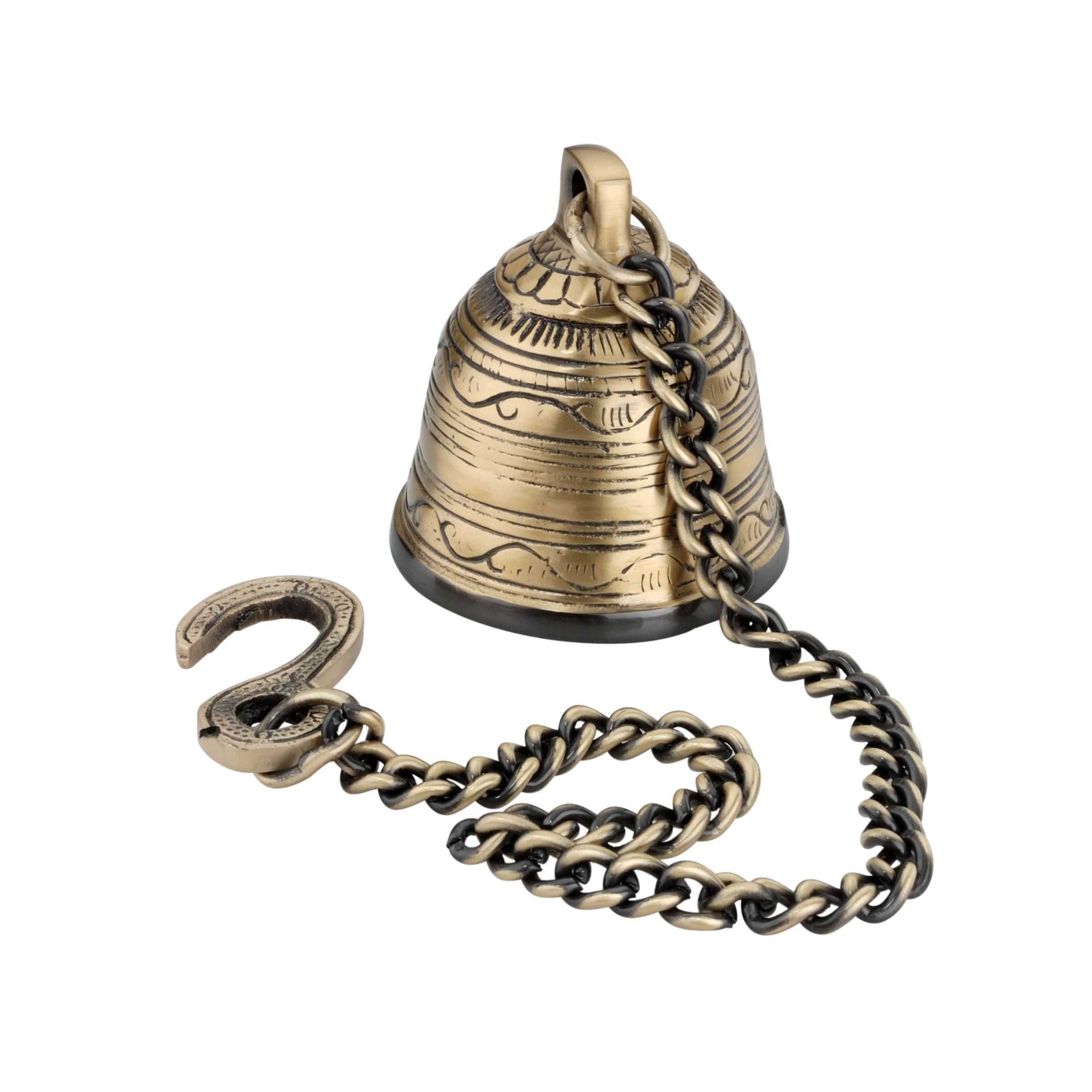 The Engraved Hanging Bell features engraved surface detailing inspired by traditional Indian motifs. Its ornate body and antique finish make it both functional and decorative. Ideal for spiritual spaces where sound, symbolism, and craftsmanship matter equally.
